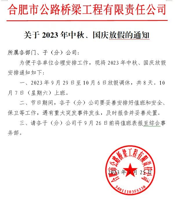 关于 2023 年中秋、国庆放假的通知