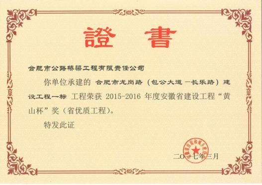 工程荣获安徽省建设工程“黄山杯”奖(省优质工程)。