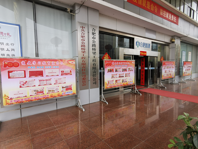 为热烈庆祝中国共产党成立100周年,推进党史学习教育深入人心,合肥路桥党支部精心谋划,在一楼大厅设专栏,打造“党的100周年光辉历程”宣传展板。
