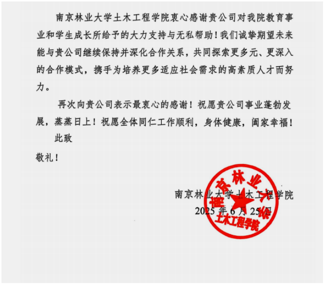 2025年6月25日,合肥路桥收到了一封来自南京林业大学土木工程学院的饱含深情的感谢信。信中,南京林业大学土木工程学院高度赞扬并衷心感谢合肥路桥在科研课题试验研究实践方面的鼎力支持,并对企业展现出的高度社会责任感表示崇高敬意。