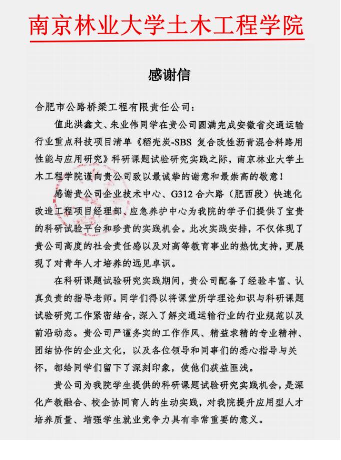 感谢信中提到,合肥路桥作为交通运输行业的领军企业,始终心系教育,情系人才。近年来,双方建立了紧密、深入且富有成效的战略合作关系,共同申报了安徽省交通运输行业重点科技项目清单《稻壳炭-SBS 复合改性沥青混合料路用性能与应用研究》,共建了研究生联合培养基地,多位企业专家受聘担任研究生校外指导教师,深度参与教学指导。